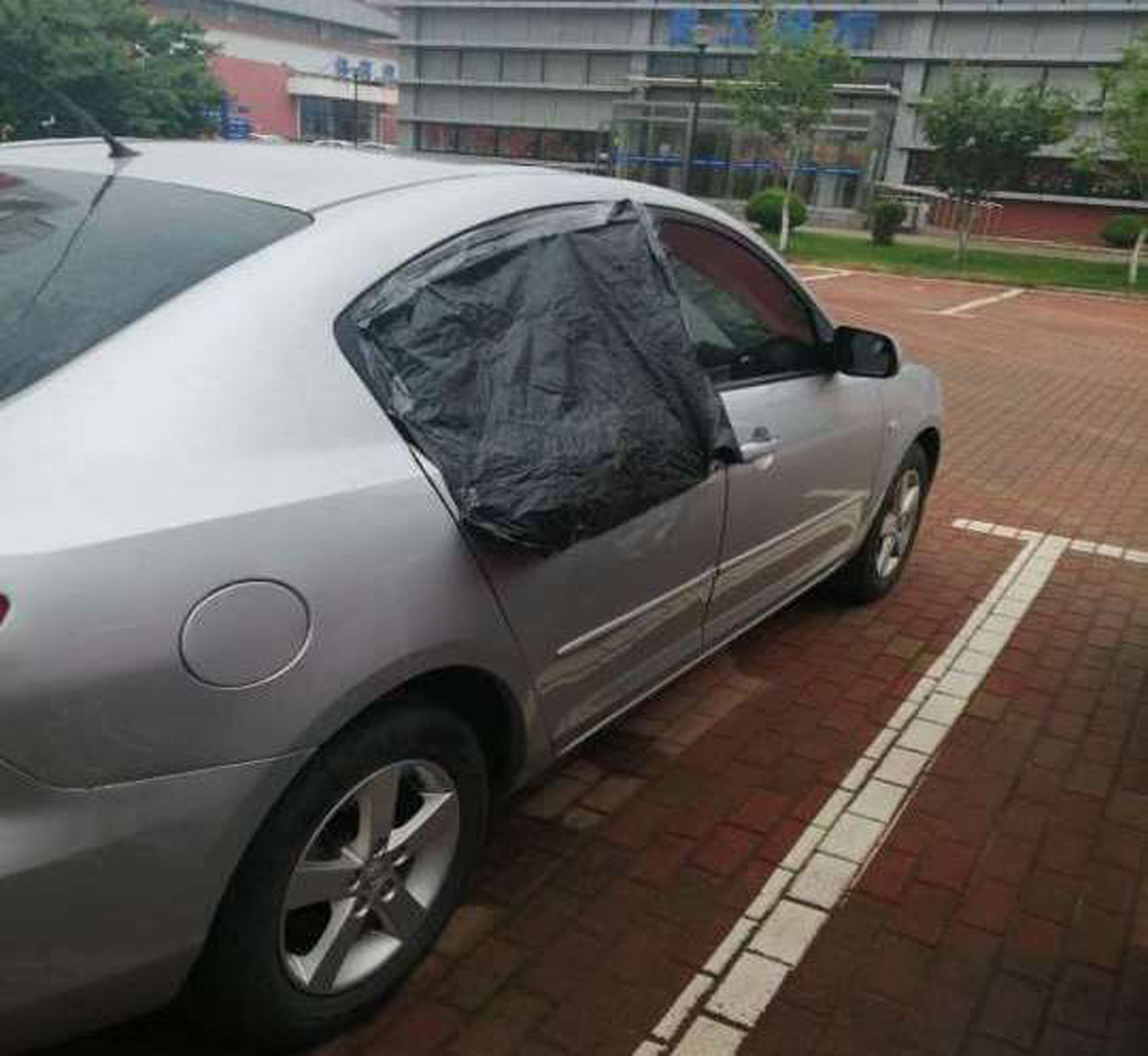 想到這里,李守玉立刻跑到車前搜尋車主電話未果,向前臺服務人員求助、說明情況尋找車主信息。前臺經(jīng)聯(lián)系車主了解到車主已返回大連市區(qū),沒辦法及時關閉車窗。在大家焦急的時候,李守玉跑了出去片刻,見他拿著透明膠帶和一塊黑色塑料布跑到車窗前,用他那粗糙有力的大手小心翼翼的粘貼著。